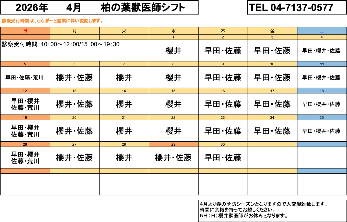 詳しくはページ下部の獣医師シフト表をご確認ください。