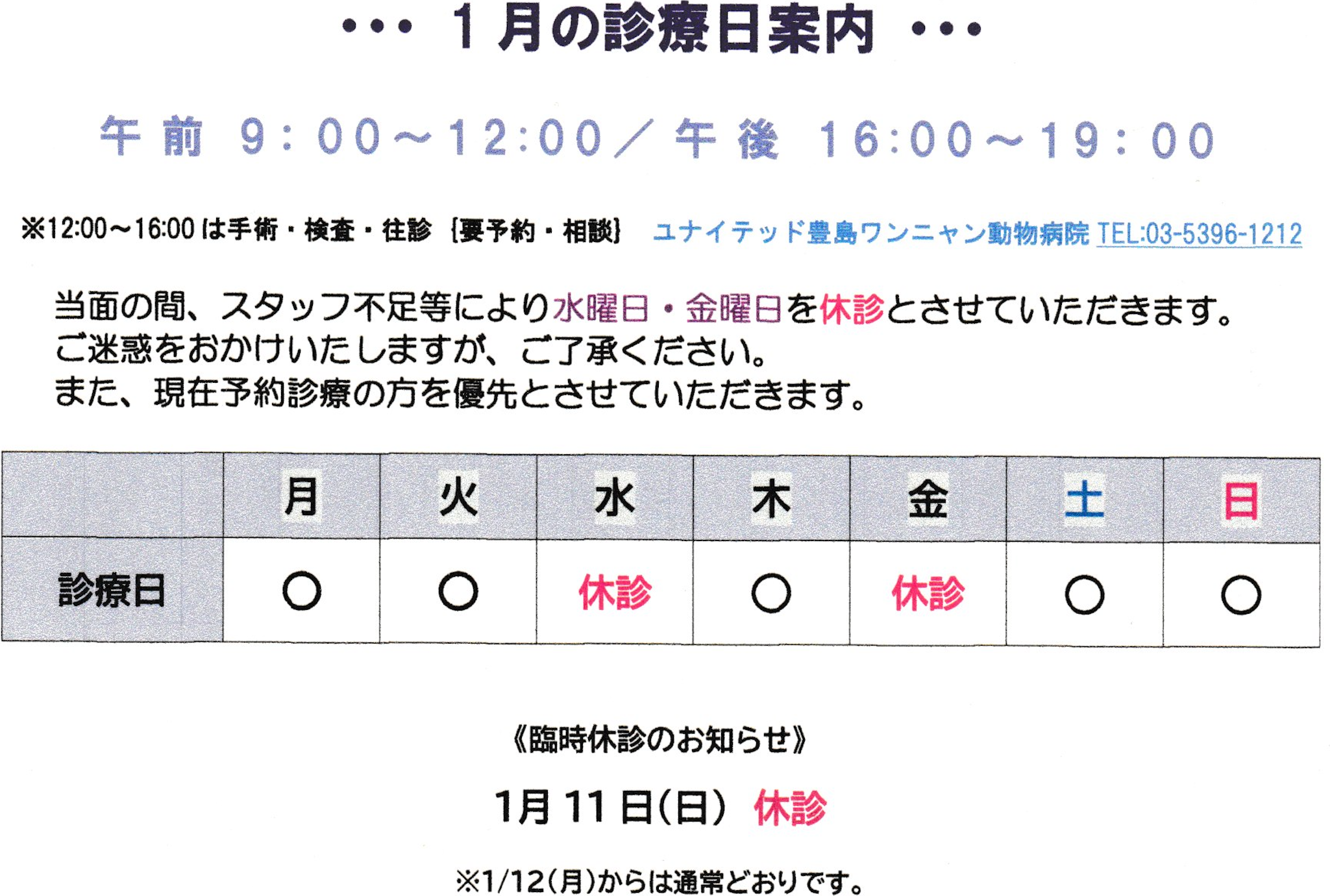 1月11日(日)は休診となります。