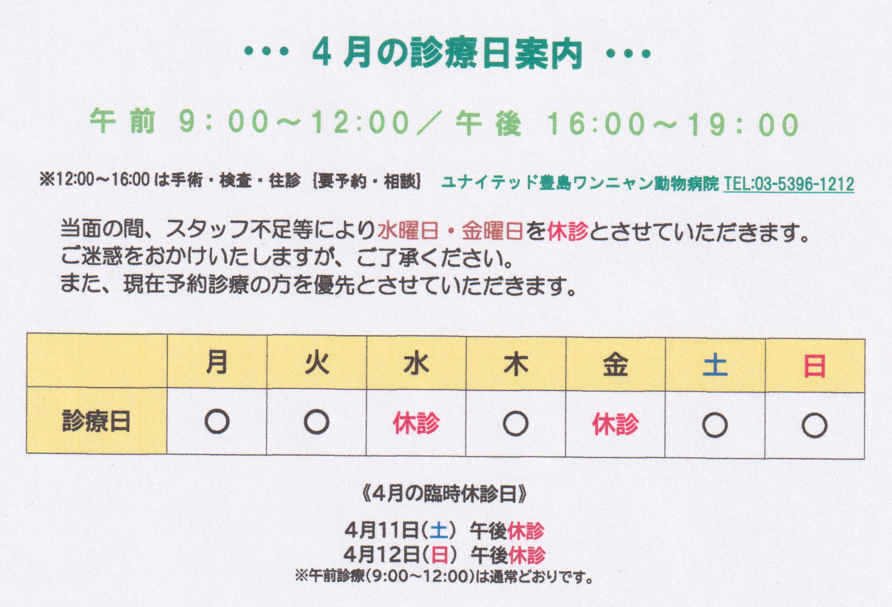4月11日(土)、12日(日)は獣医師不在のため午後休診となります。